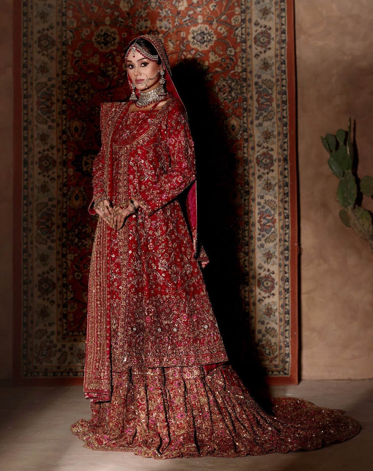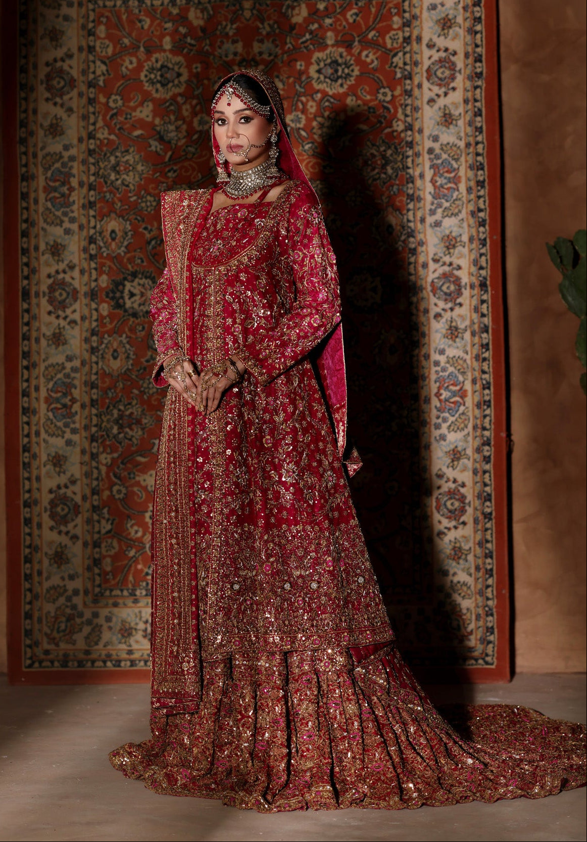 The lehenga is constructed with dramatic volume and an extended embroidered train, engineered to sweep behind the bride with regal fluidity. Every panel is meticulously hand-worked to build depth, weight, and dimension, anchoring the silhouette with unmistakable bridal presence. The look is completed with dual dupattas — one richly bordered to frame the ensemble and one lighter, veil-like layer — adding ceremonial drama and architectural balance.