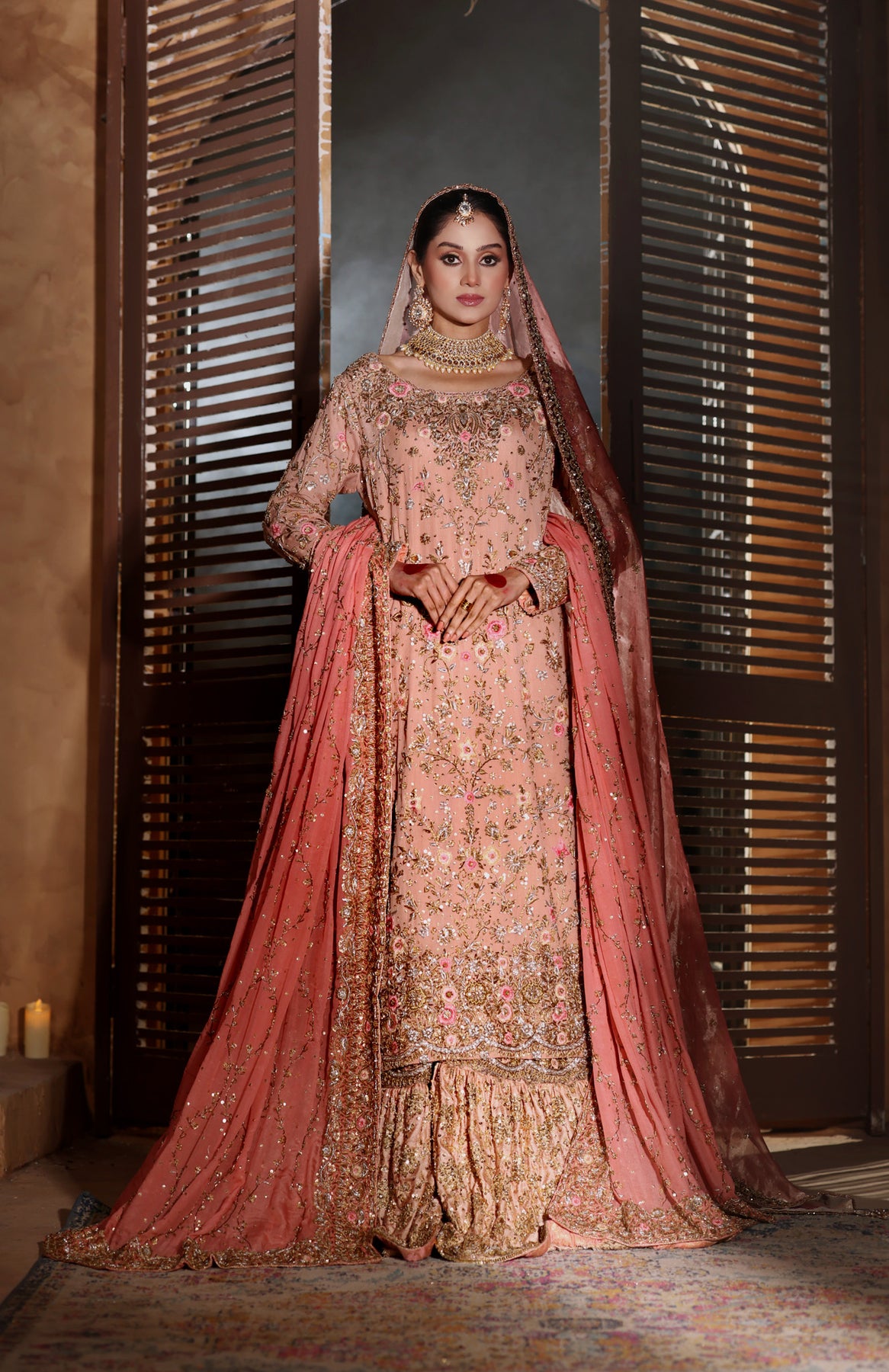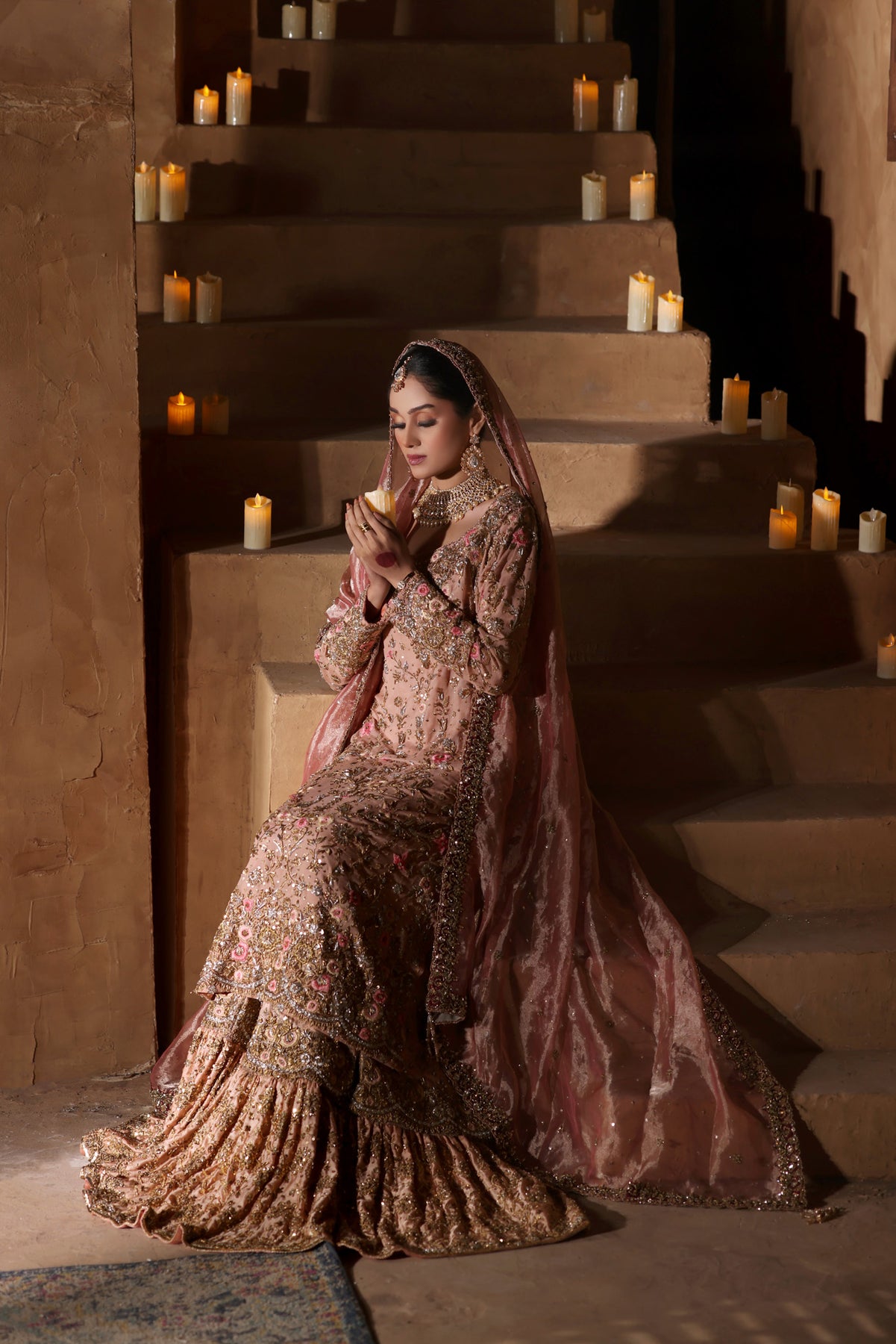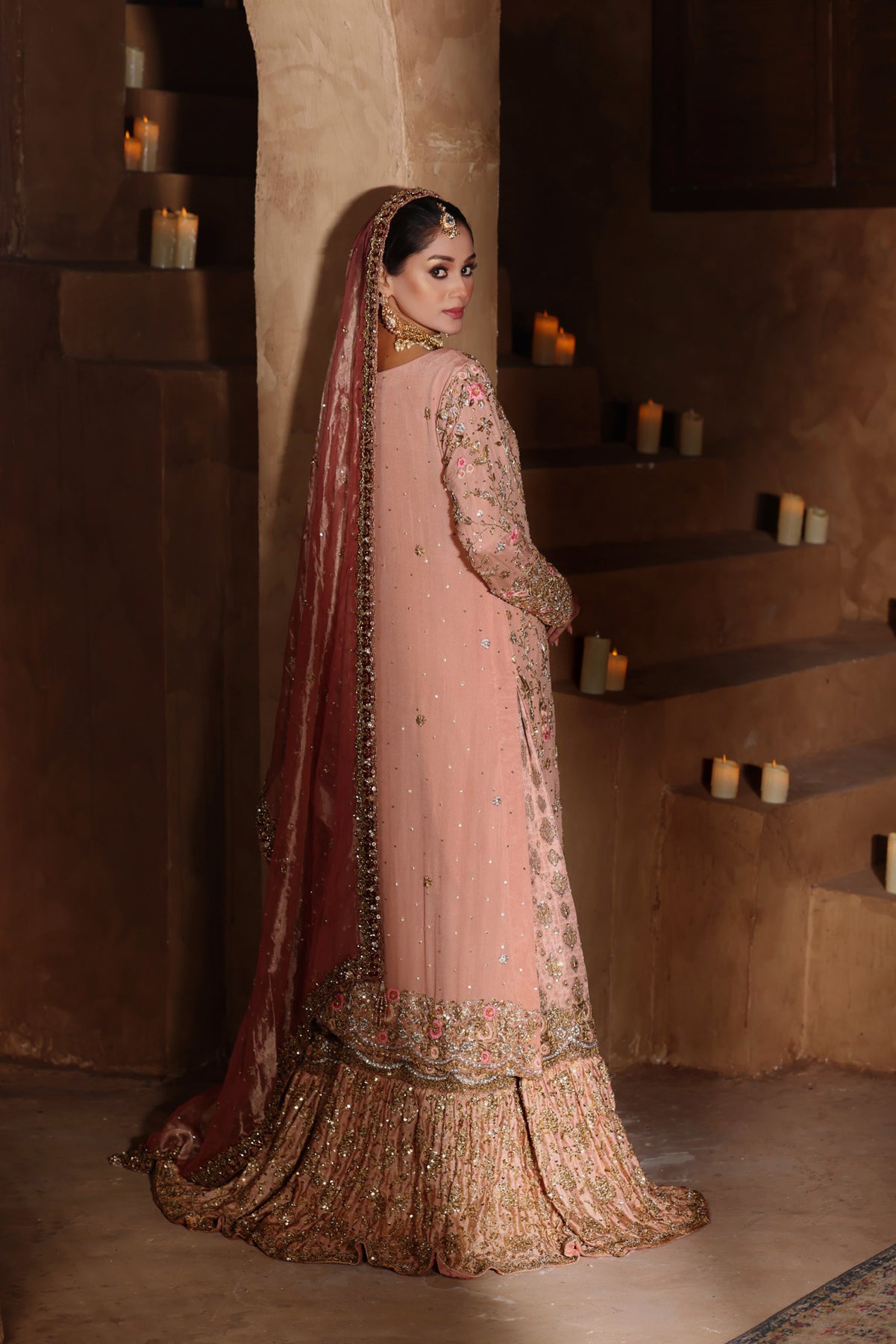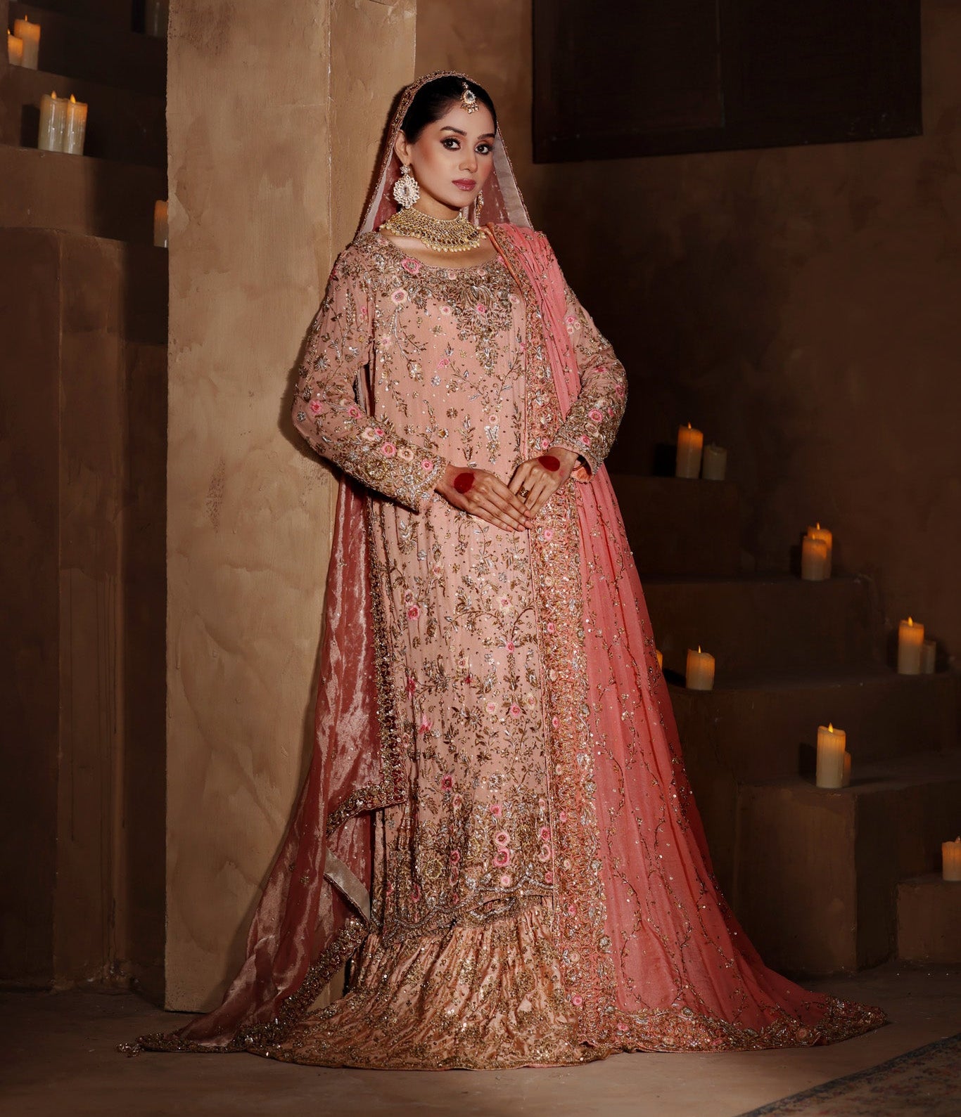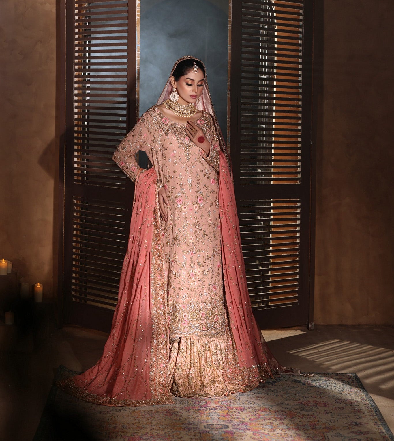 A romantic study in soft blush tones, this bridal ensemble is layered with delicate artistry and refined handwork. The long shirt is intricately adorned with floral zardozi, resham, and crystal embroidery, creating a luminous garden of texture across the surface. The silhouette flows into a softly gathered farshi skirt, adding movement and graceful volume while maintaining an elegant, elongated line.