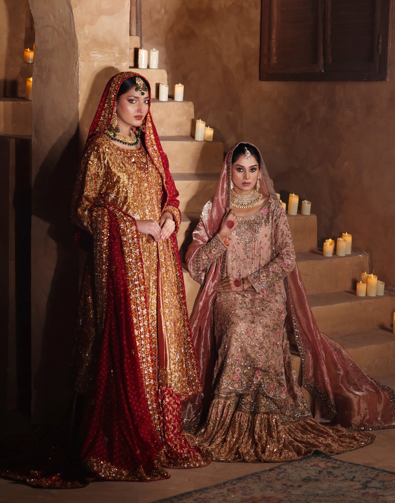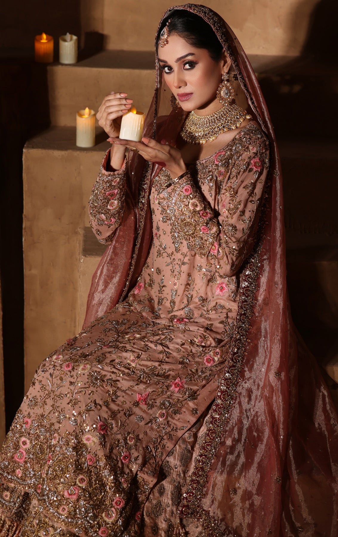 Paired with a richly embellished dupatta in a complementary rose hue, the look is framed with ornate borders and fine detailing that catches the light from every angle. Feminine, regal, and heirloom in spirit, this piece is designed for a bride who favors understated luxury with unmistakable craftsmanship.