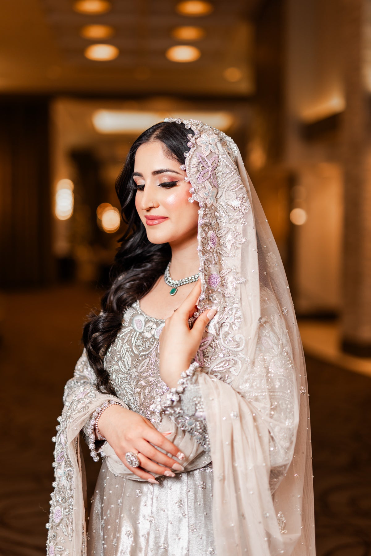 Be the radiant bride in Sylvia's stunning, 3-piece ensemble. A breathtaking steel grey/silver gown adorned with silver dabka, crystals, and white pearls, accented with touches of lilac, pink, and grey thread work. The net dupatta in nude pink adds a touch of elegance with its heavy matha patti and subtle border. And the intricately designed silver stone belt adds the perfect finishing touch. Feel like a true queen on your special day with Sylvia.