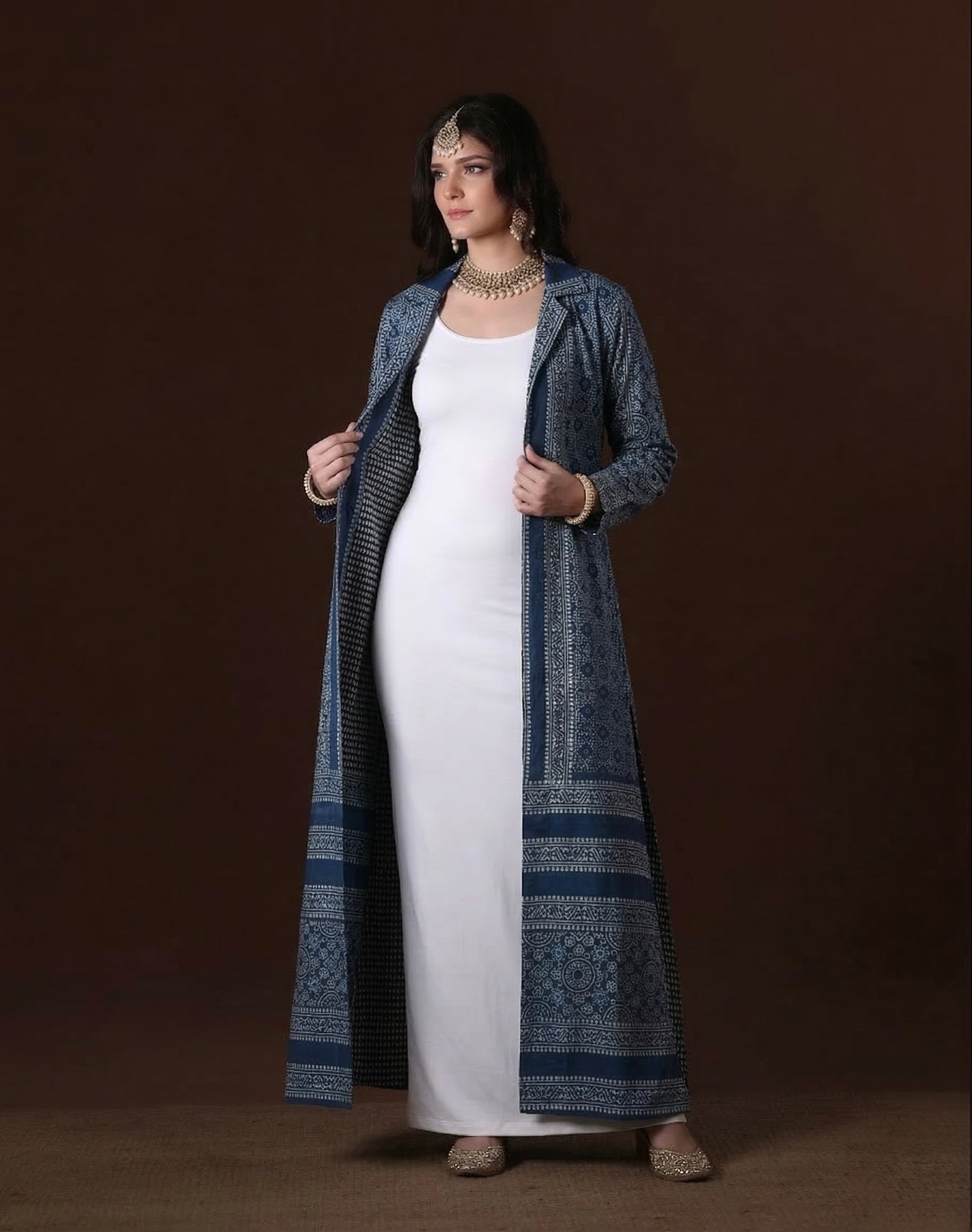 A beautifully crafted cotton jacket featuring intricate printed motifs in rich indigo tones, designed in a timeless open-front silhouette with a classic collared neckline. The detailed borders and thoughtfully placed patterns create a striking visual balance, giving the piece a refined yet effortless appeal.