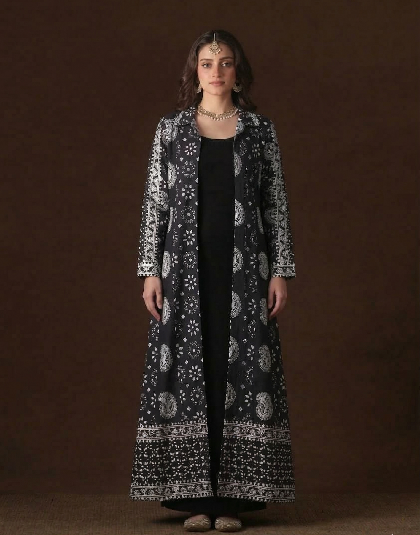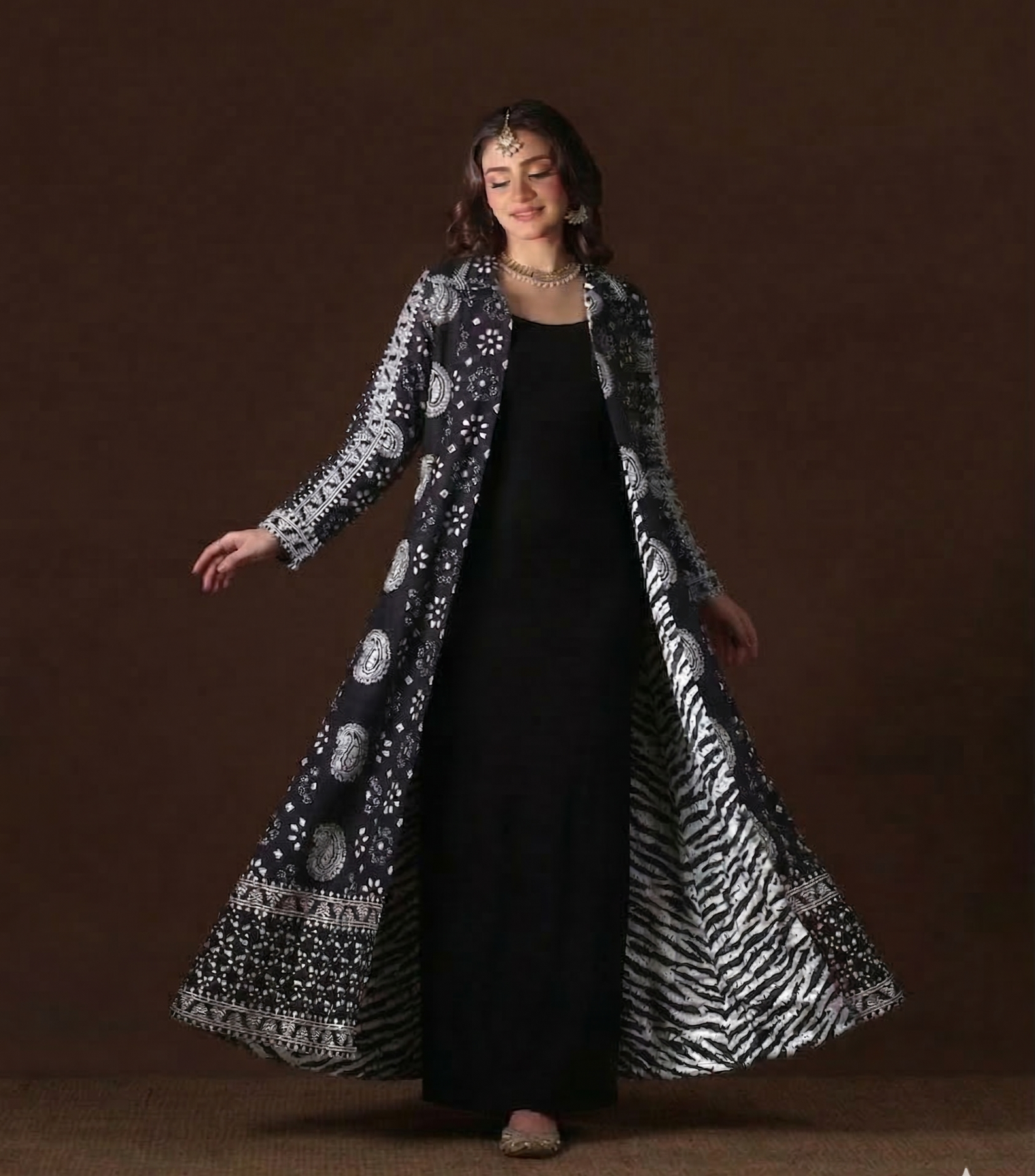 This floor length, collared jacket features an intricate black and white paisley block print, seamlessly blending traditional artistry with a modern, structured silhouette. Crafted for versatility, the open-front design reveals a bold zebra-print silk lining, offering a striking high-fashion contrast with every movement. Perfect for layering over a sleek bodycon maxi or a basic t-shirt & jeans, this statement piece transitions effortlessly from elevated daywear to sophisticated evening formal.