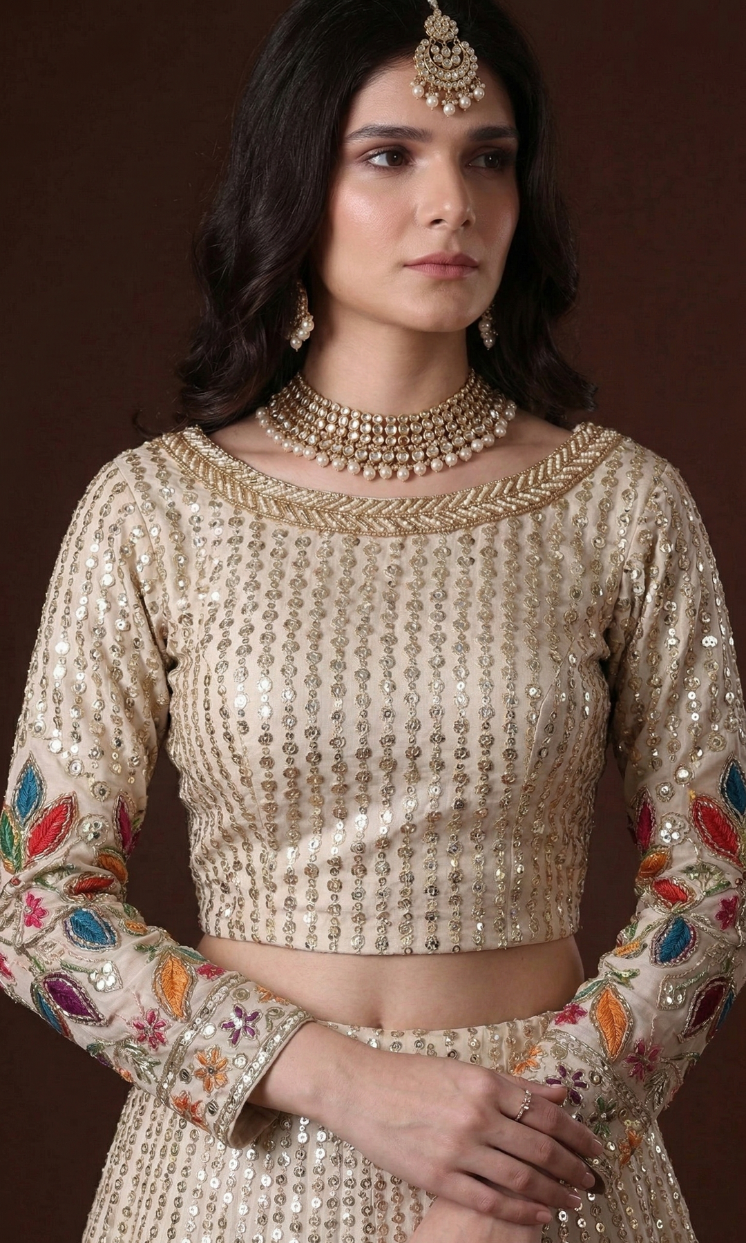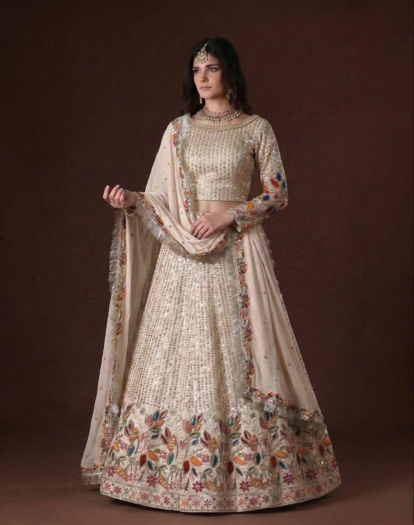 Three items: A choli/ cropped shirt, lehenga/ skirt & dupatta