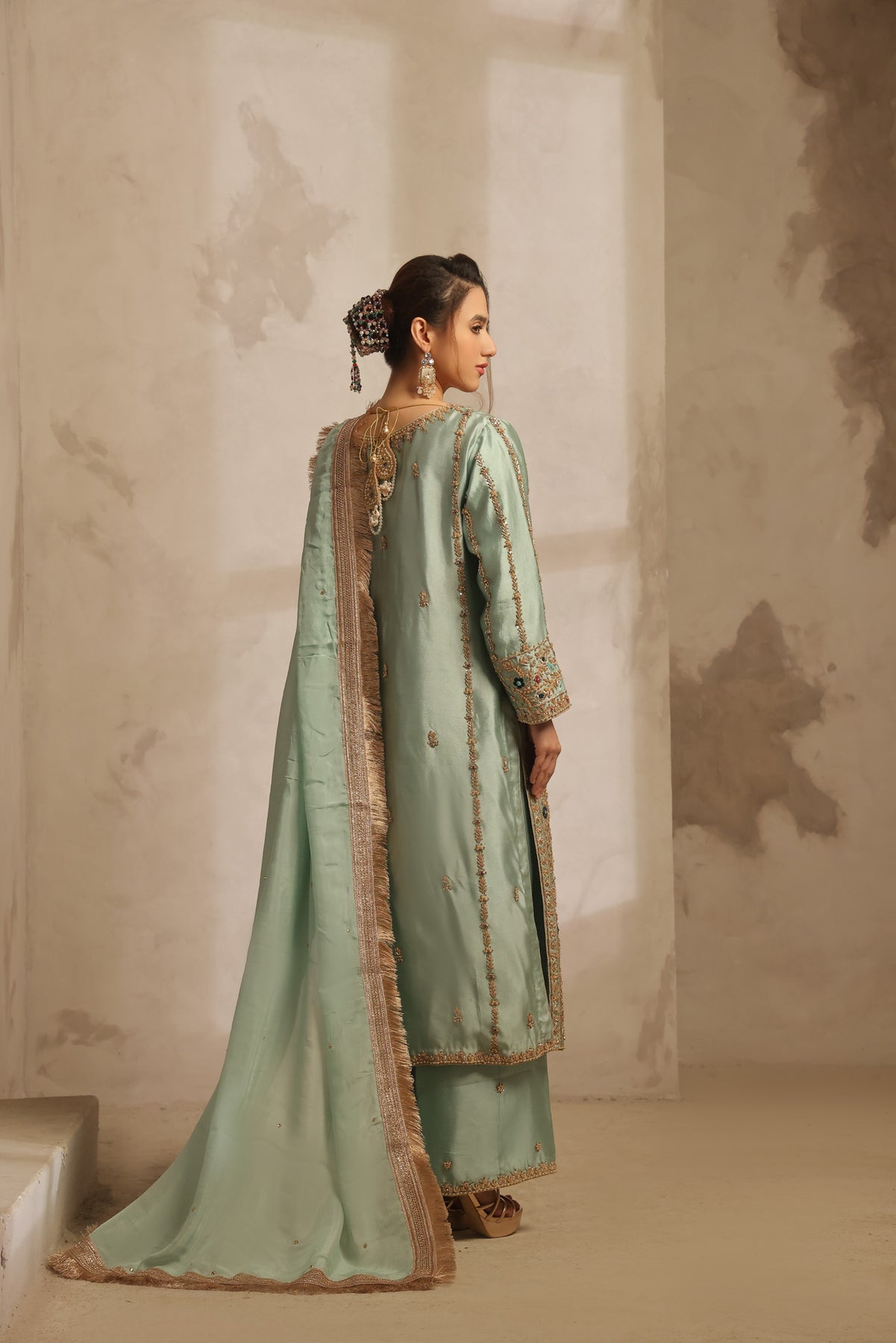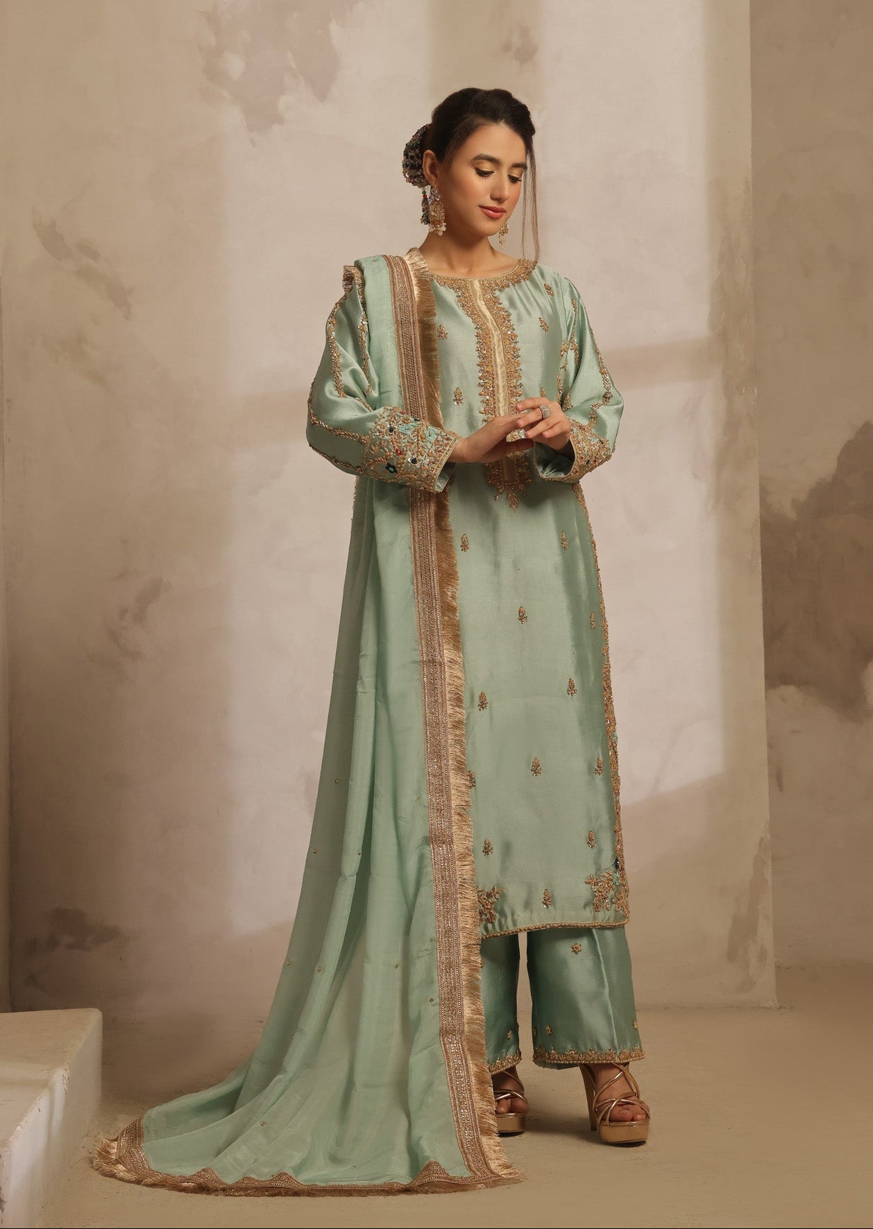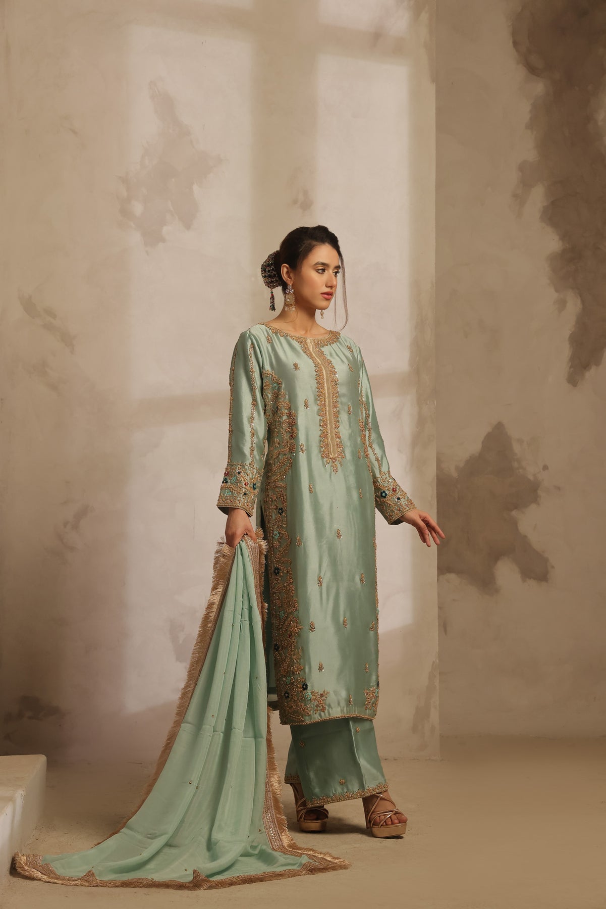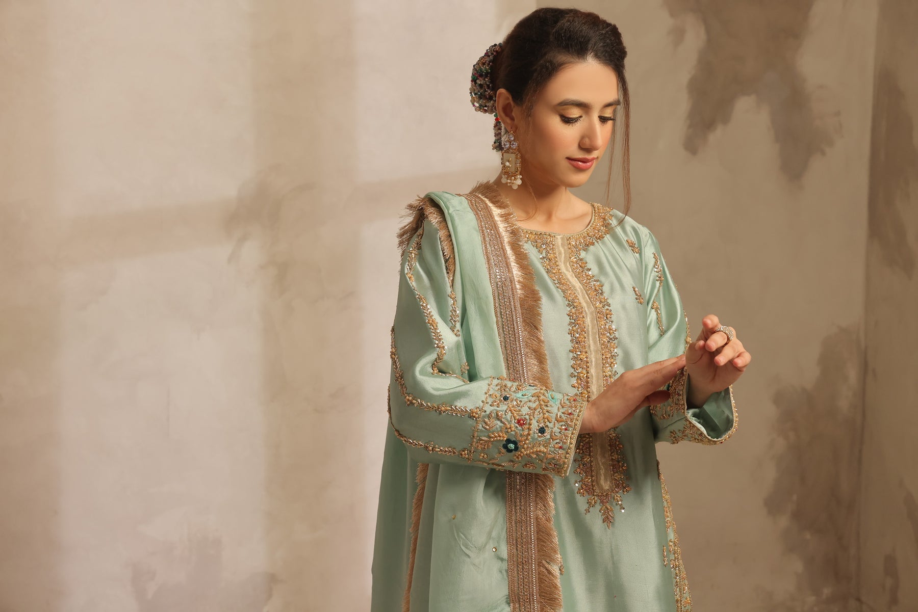 Elevate your formal wardrobe with the Nisa three-piece set in refreshing mint green. Crafted from luxurious sheesha silk, this ensemble features a silk dupatta adorned with gold kiran edging for a refined finish. Intricate gold dabka and champagne pearl embellishments, accented with red crystals and delicate green and mint threadwork, enrich the design with depth and elegance. The gold tissue finish adds subtle shimmer, while the trousers are detailed with a meticulously worked border on the hem. Perfectly balanced and expertly crafted, this outfit promises to make a lasting impression at any special occasion.