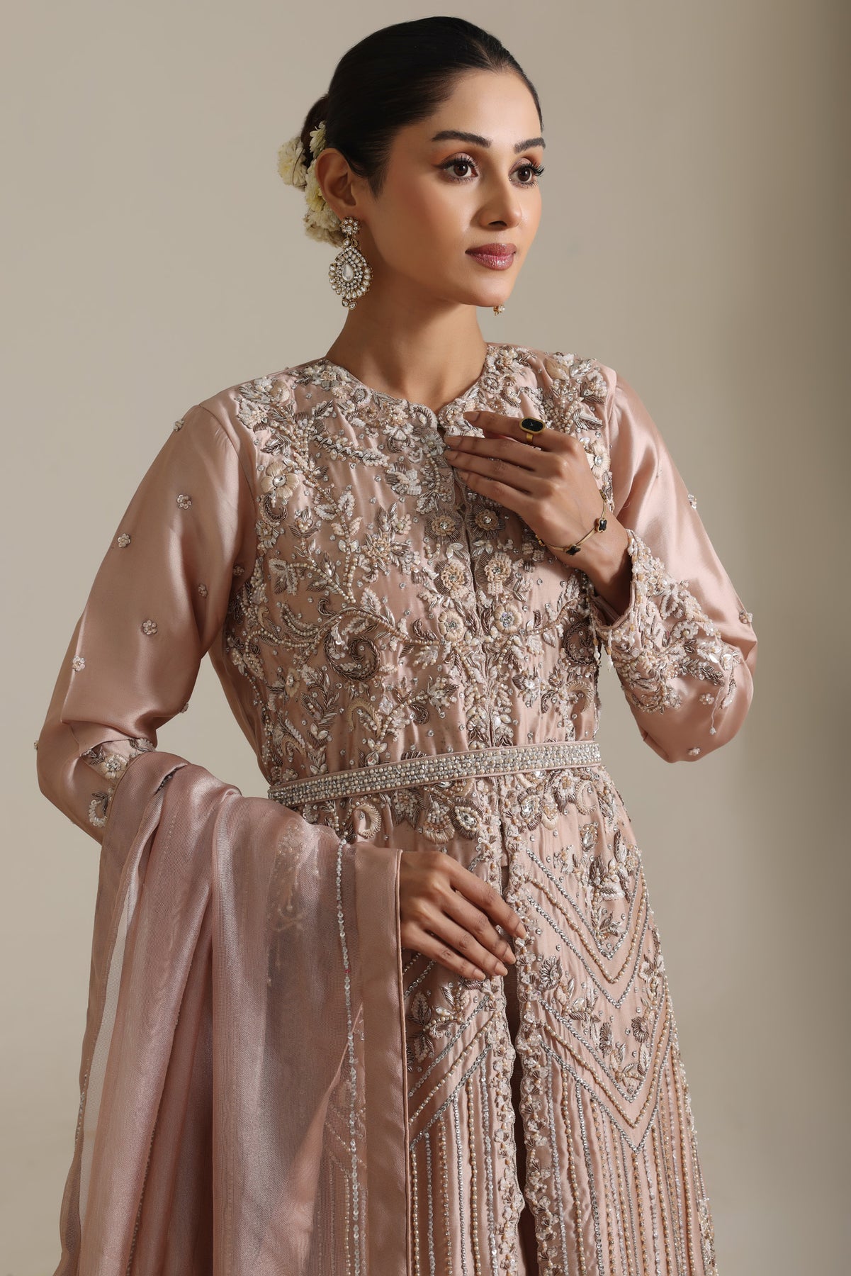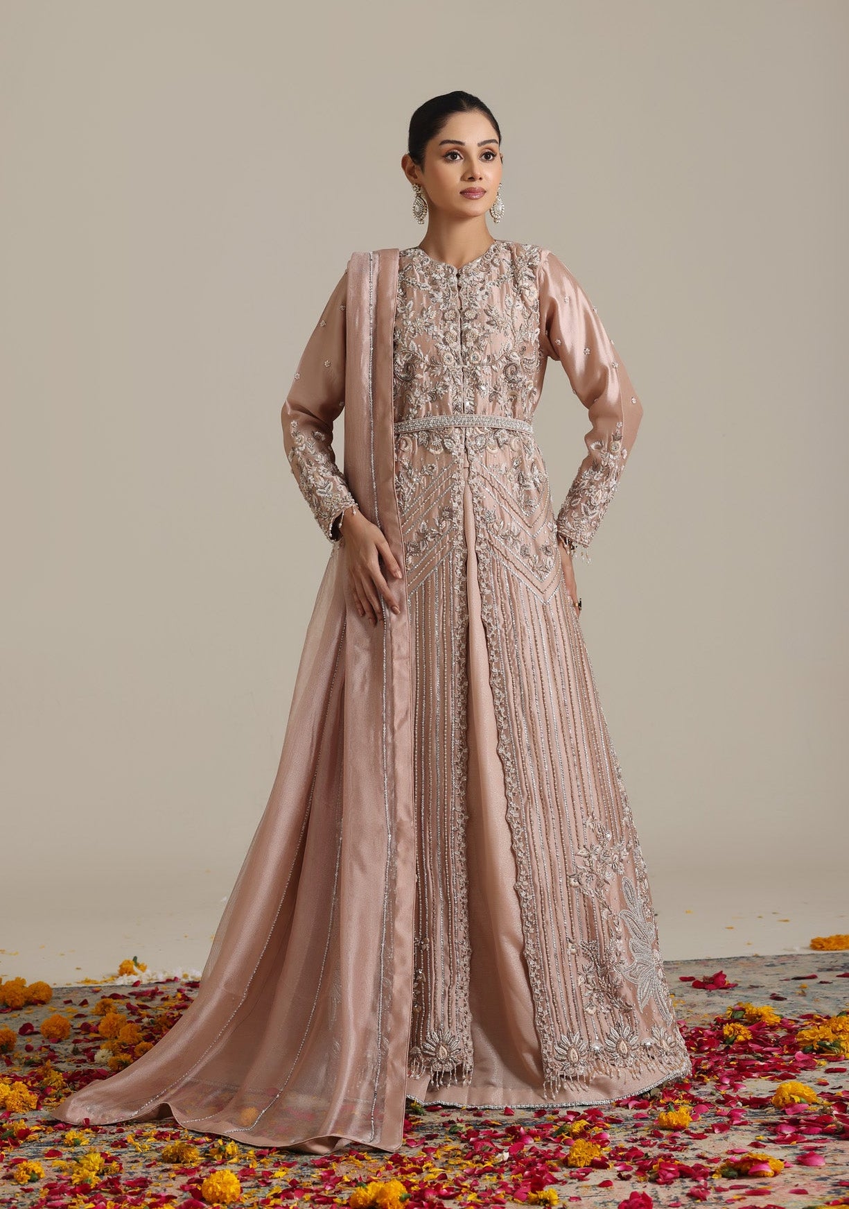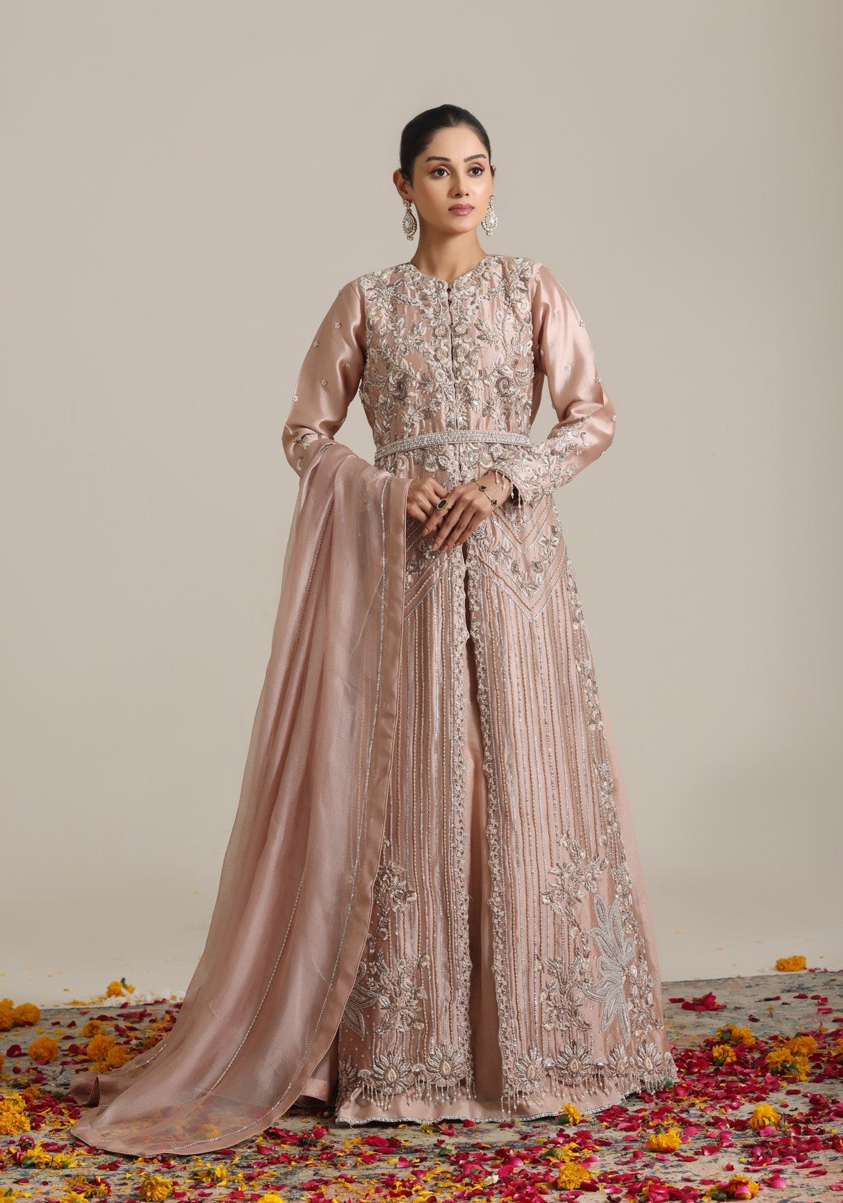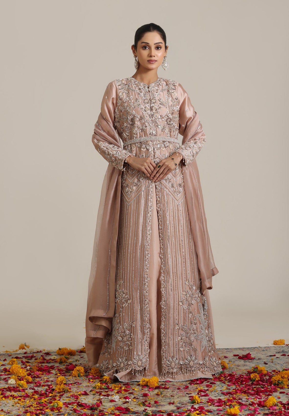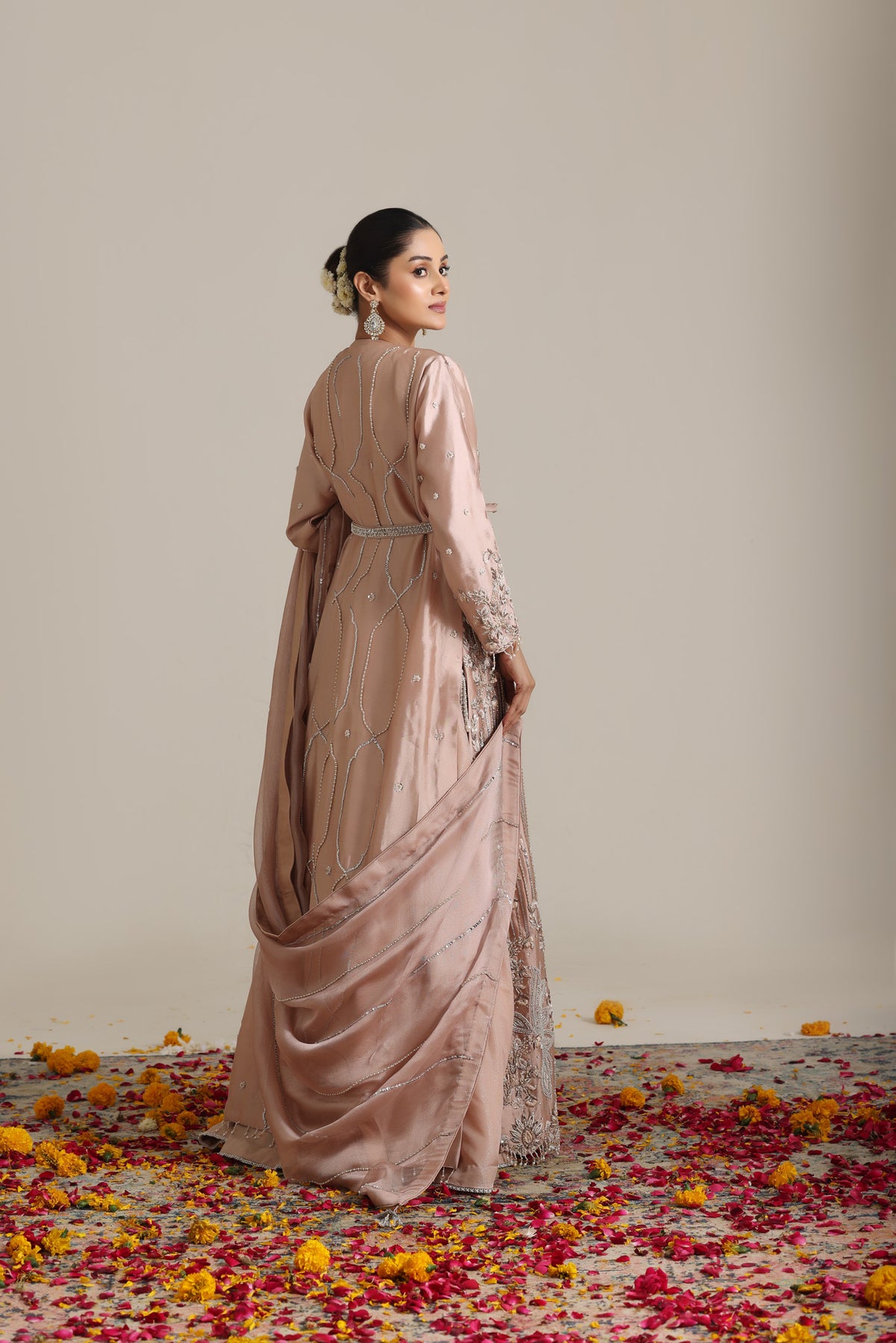 Five items: A cropped undershirt/ choli, skirt, front-open long gown, dupatta & belt