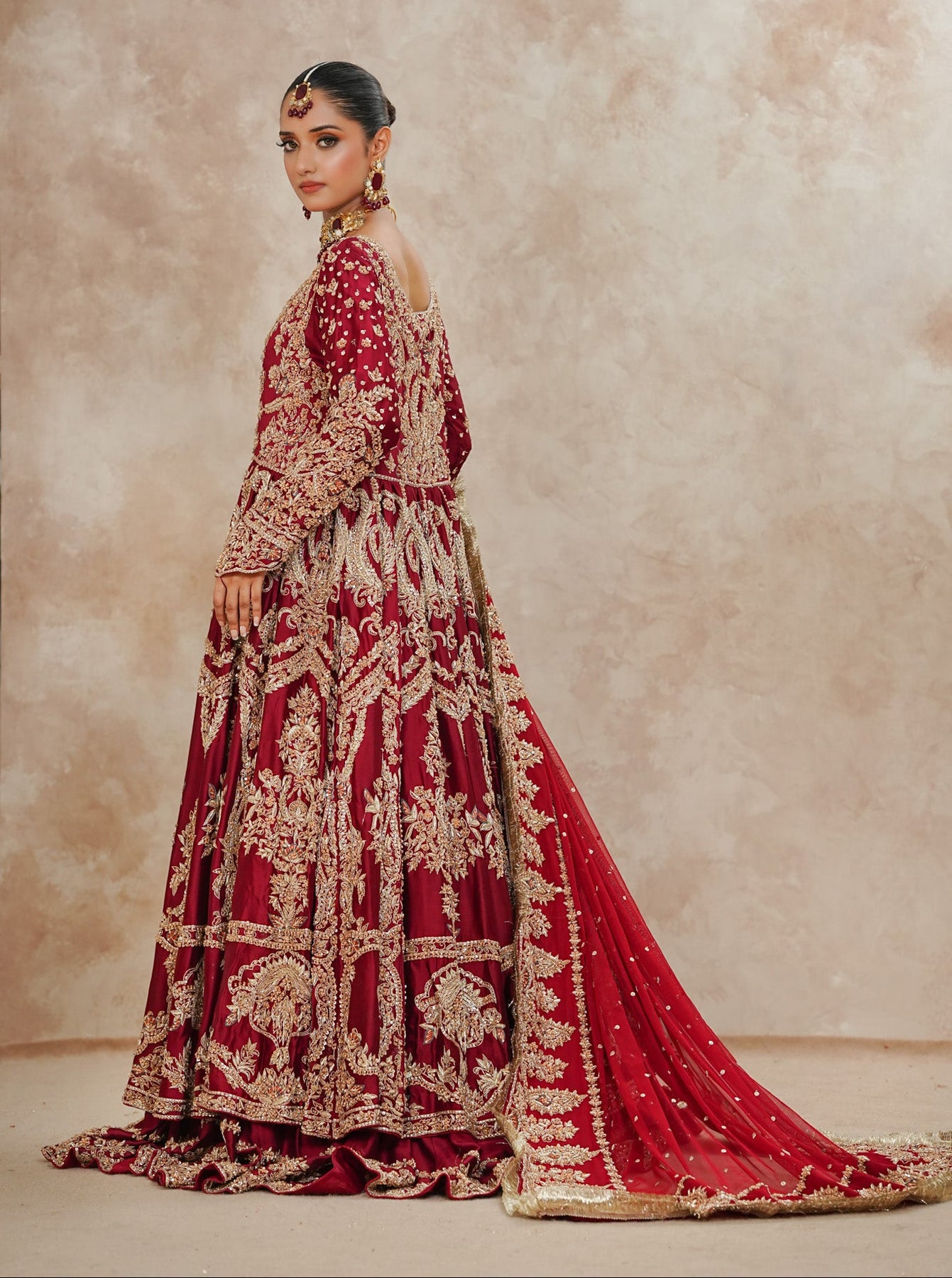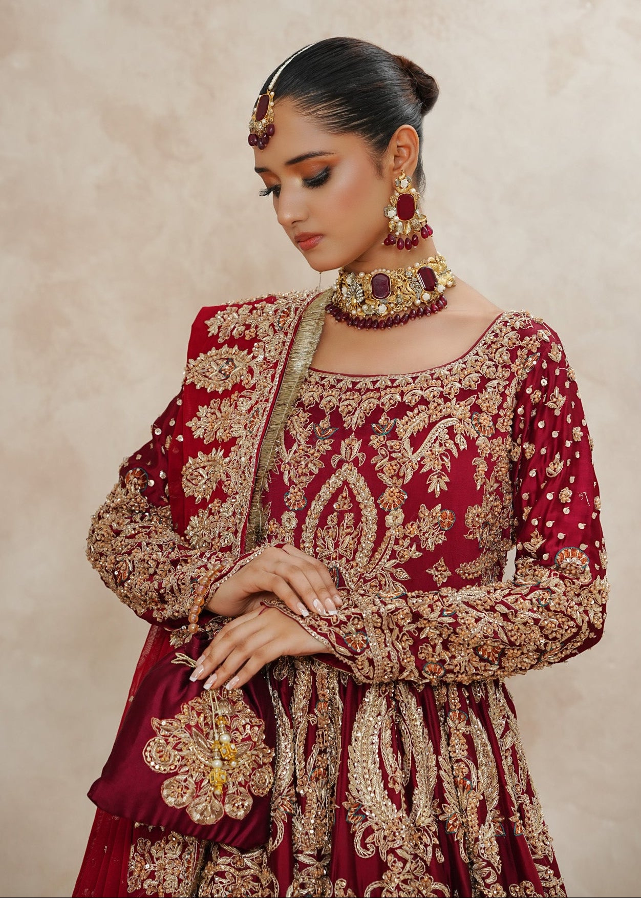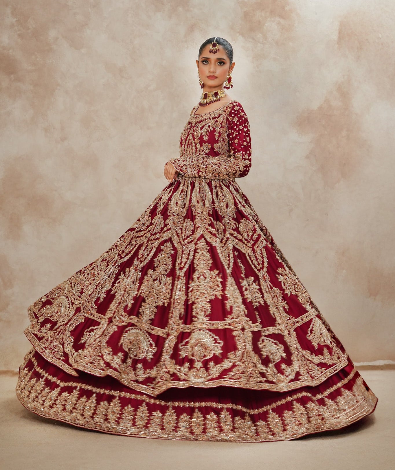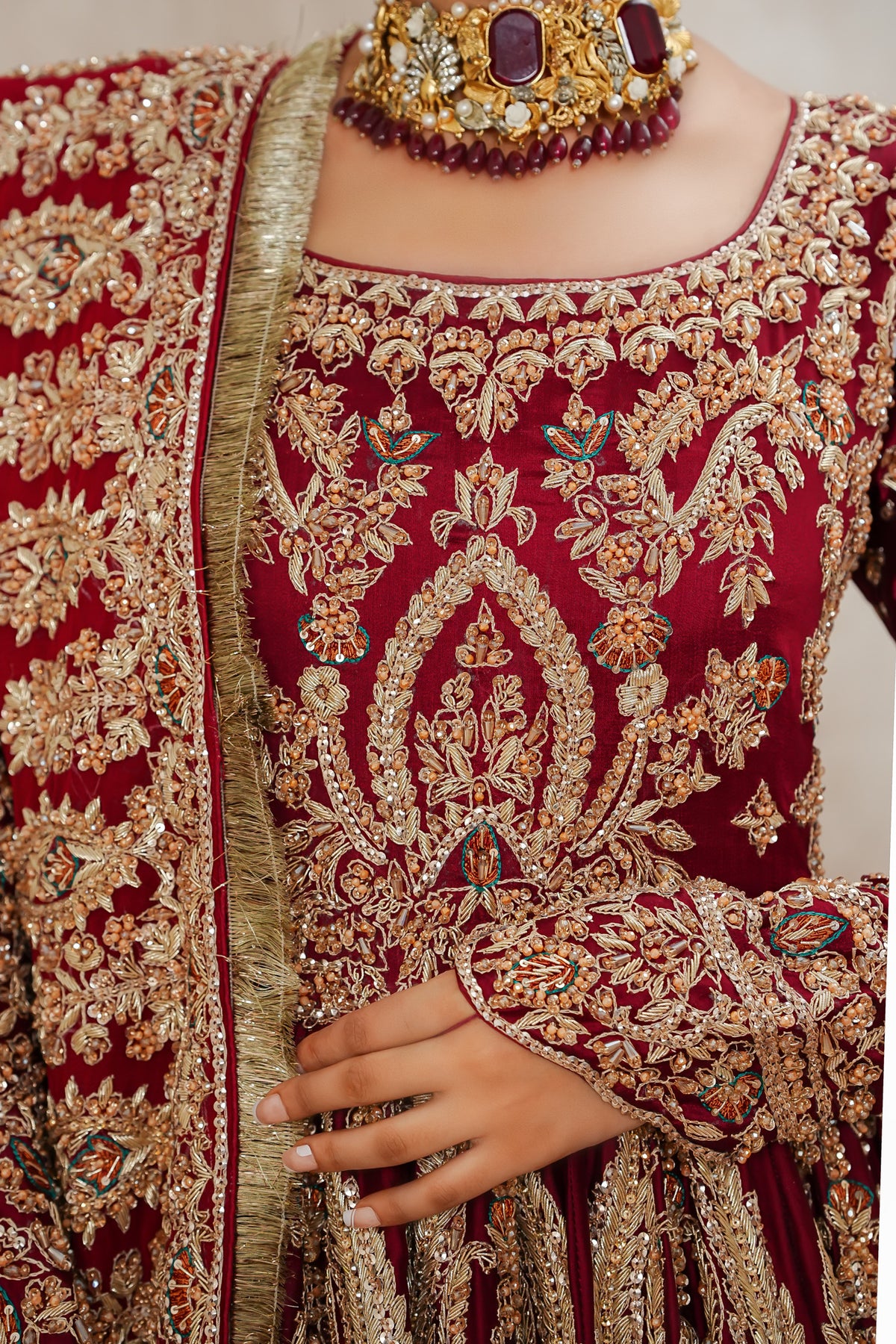 Introducing Abrima, an exquisite bridal gown crafted for the discerning bride. This hand-embroidered masterpiece features luxurious sheesha silk in a rich dark red, showcasing intricate dual-layered construction. The gown is adorned with opulent gold dabka and champagne beadwork, complemented by subtle hints of green and rust detailing. An attached can-can provides graceful volume and movement. The ensemble includes a matching net dupatta embellished with identical borders on all four sides, delicate chun booti throughout, and elegant gold kiran edging. Every stitch reflects timeless elegance and meticulous craftsmanship, making this gown a stunning choice for your most cherished celebration.