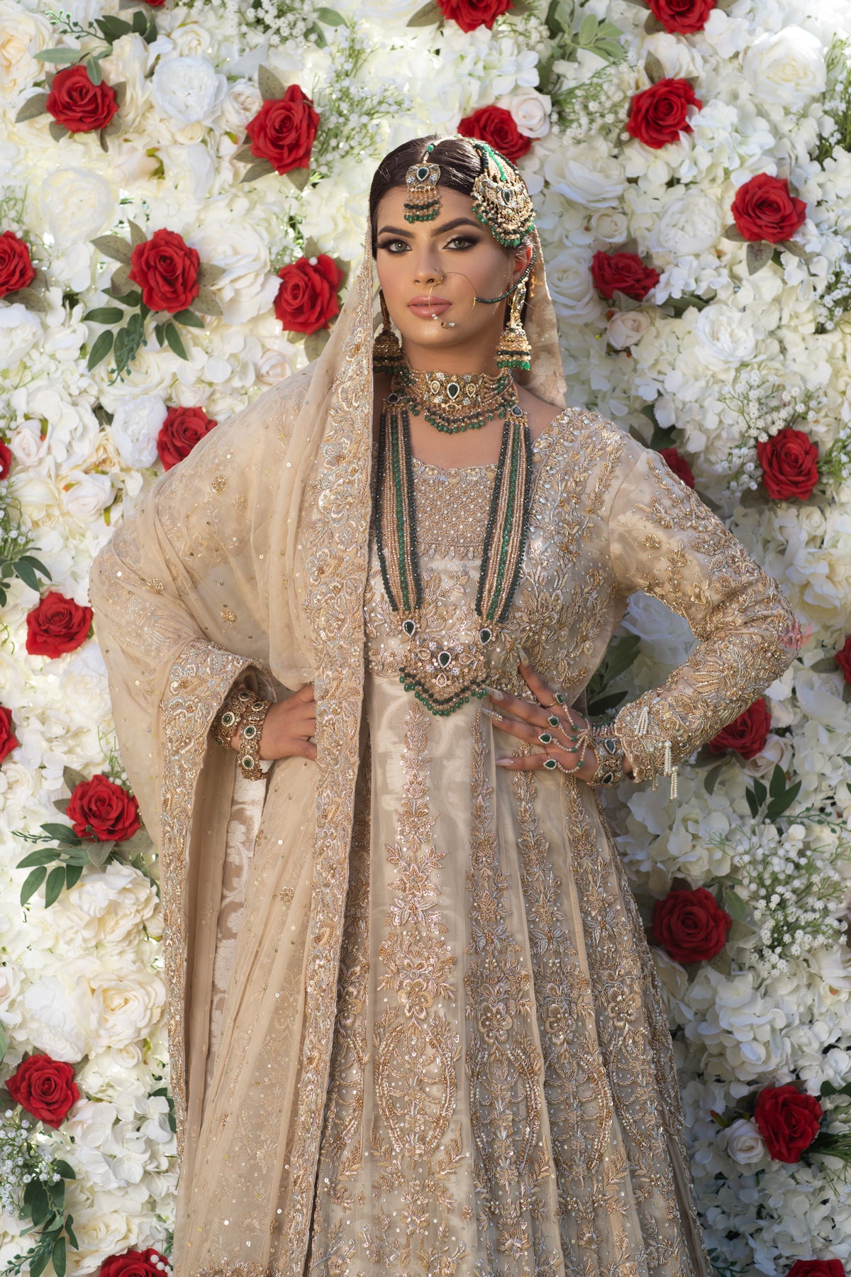 Make your big day extra special with Mumina, a heavily embellished floor length gown that comes with two elegant dupattas: a matching one and another with a contrast red hue. The perfect royal choice for brides who want to stand out, Mumina can be customized as well. Pair it with the perfect contrast jewelry to complete your look and shine like the diva you are!